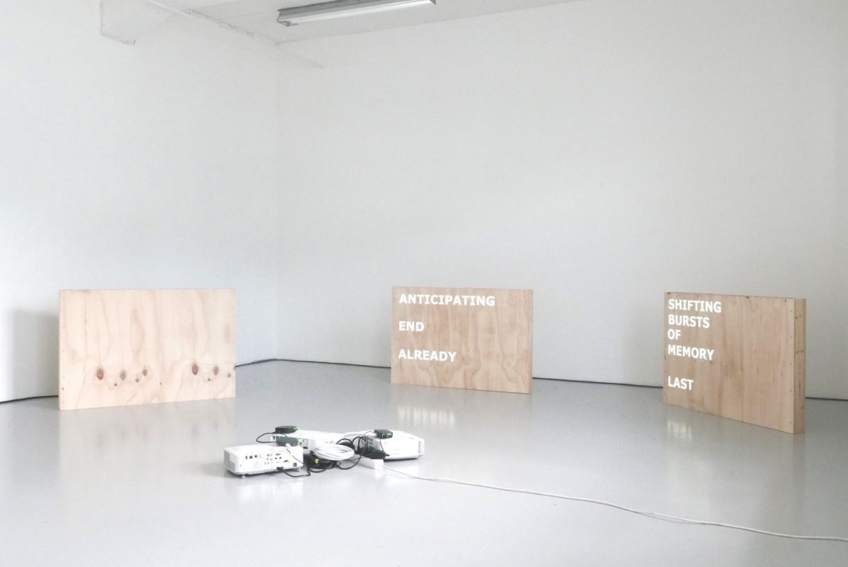 In a similar construction, my work everything will cease in the present took three phrases from Marcel Proust’s Remembrance of Things Past and flashed randomised sections from each at just over 8 second intervals, never showing the full phrase. This work centered around the ‘perceptual present’: the short duration for which we link concurrent events as happening ‘now’. After this, it slips into memory, no longer experienced in the subjective rhythmisation of ‘now’.