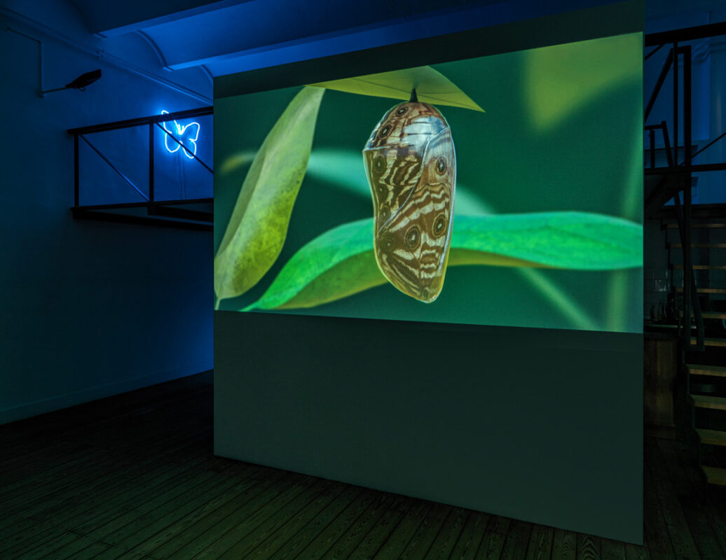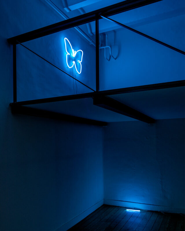 At sunset during the exhibition’s opening, I presented a vocal performance developed in collaboration with a local choir. During regular opening hours, the silent film was accompanied by a sound piece recorded with voice artist Miyuki Inoue. The installation also included a series of neon light works, referencing nocturnal insects’ fascination with artificial sources of light.