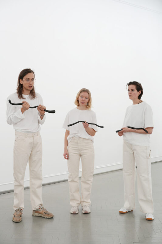 The work also includes a sound piece. Three voices can be heard humming, singing, and breathing, evoking associations with various animals. At times, there’s heavy breathing, reminiscent of the sound of deep sleep.