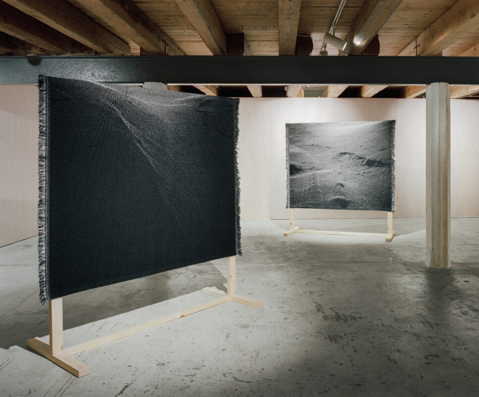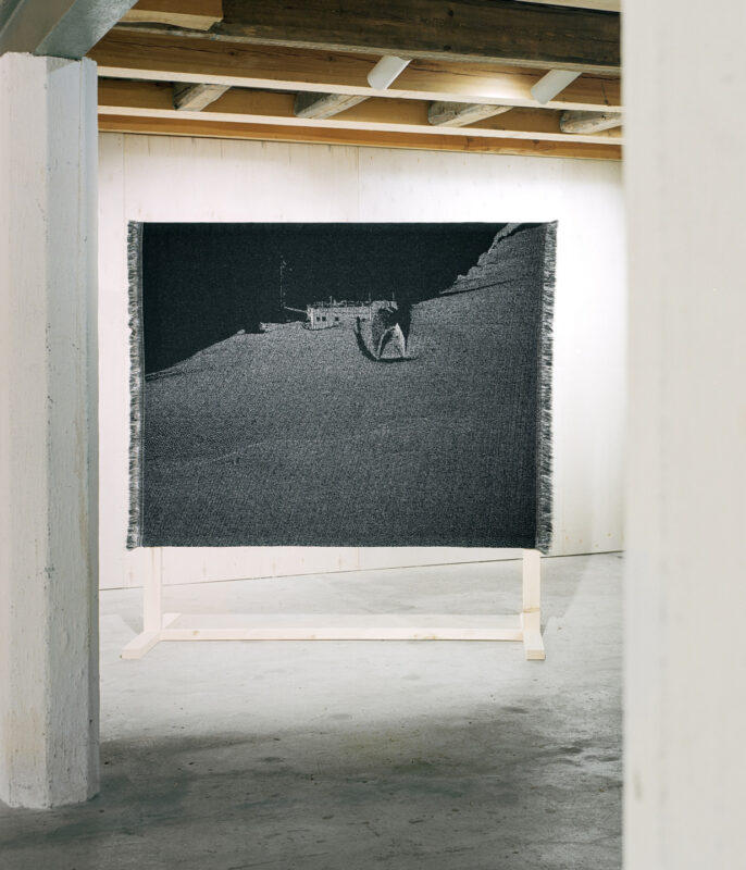 After a series of residencies in the scientific research village of Ny-Ålesund in Svalbard, I made the textile and sound installation Hymnosphere, comprising three woven tapestries based on laser reflectance depictions of the surrounding landscape, made together with a snow and avalanche researcher. Due to climate warming, Svalbard is experiencing an increase in rain-induced avalanches. The images of the avalanche that occurred during my stay resemble nightscapes or extraterrestrial landscapes.