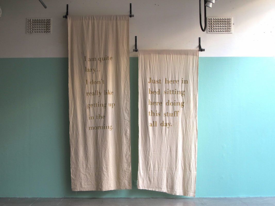 Arbeidet «Dear Heenaben, I´m showing your embroidery in Stockholm now. It looks great!» (2013) er et arbeid som ble avgjørende for meg selv, da jeg i prosessen begynte å stille de spørsmålene som jeg fortsetter å stille idag, i så mange ulike sammenheng. I Gujarat, India, snakket jeg med folk som jobba med å brodere, veve og spinne for hånd. Disse feltene har direkte historiske koblinger med Mahatma Gandhis tanker om motstand og frigjøring. Å se om hvordan enkelte typer arbeid kan knyttes så tett en filosofi og politisk bevegelse fikk meg til å tenke. Det ble tydeligere for meg, i dette arbeidet, hvordan jeg kan se mitt nesten tvangsarta forhold til arbeid i lys av en protestantisk kontekst.