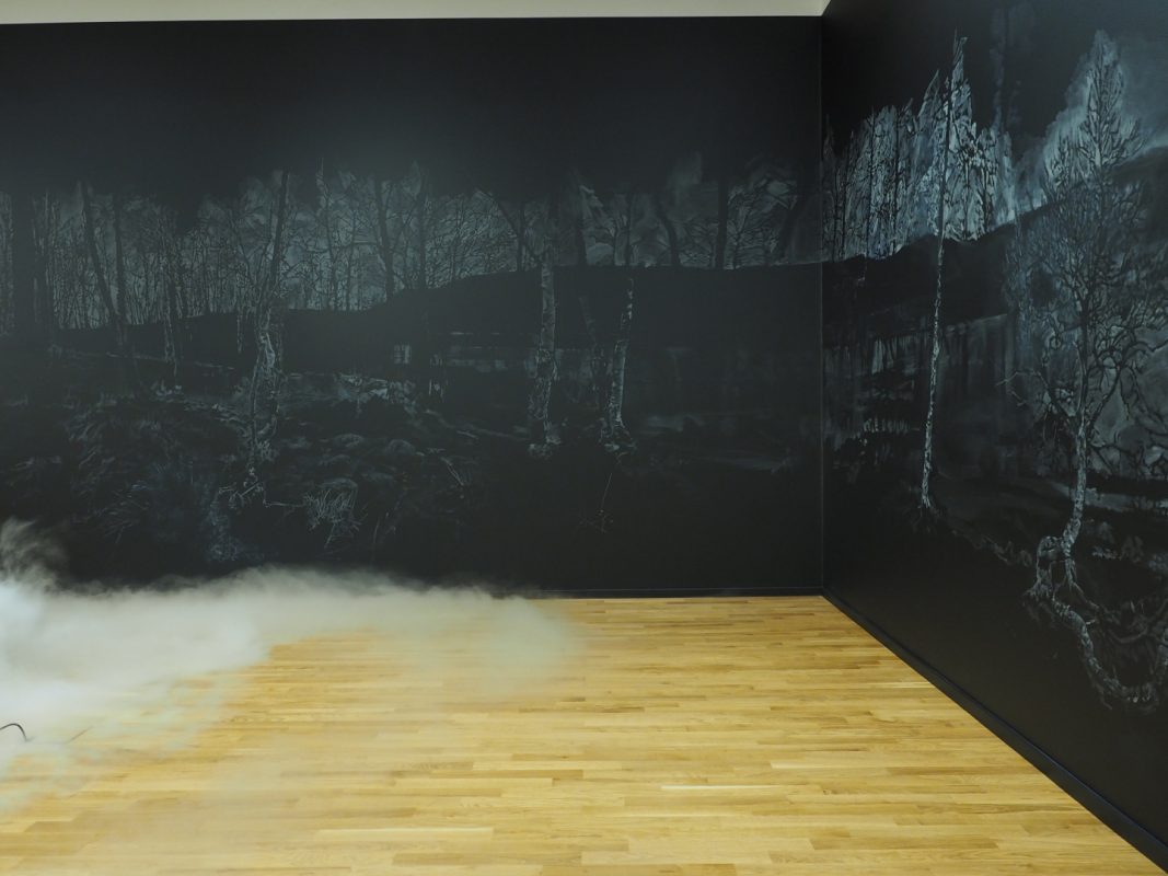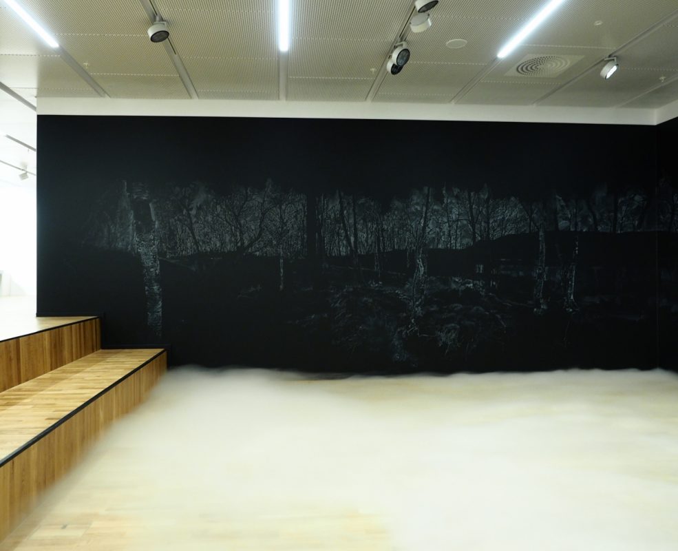 Den kombinerer en 32 meter lang veggtegning og 12-kanals surroundlyd til en oppslukende installasjon. Tegninger og lyd er utviklet på stedet over fem hektiske dager foran åpningen. Jeg videreutviklet kritt-tegningen kontinuerlig gjennom hele uken, slik at skyene endret seg fra dag til dag. Siste dagen endte i destruksjon, hvor jeg visket ut hele verket.