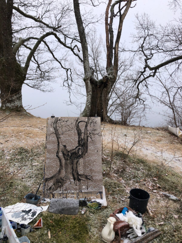 Mine arbeider hører til i landskapstradisjonen, med tegning og maleri. Men jeg jobber med landskaper veldig fritt og prosessorientert. Jeg jobber utelukkende plein air, altså i friluft, under åpen himmel med direkte observasjon og oftest i interaksjon med været og omgivelsene i skogen der jeg har min base.
