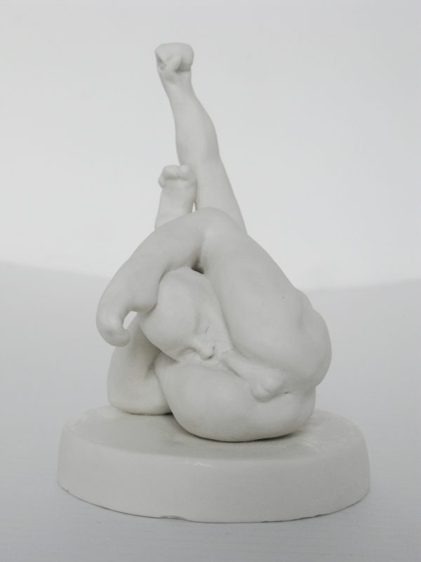 Det siste halvåret har jeg jobbet med en serie i porselen, som tar utgangspunkt i den noe kitchy nipsestetikken. Jeg liker å leke med grensene mellom høy- og lavkultur, og jeg gleder meg over å endre nipsens lavkulturelle status ved å trekke den inn i kunstrommet. Selv om nipsgjenstandens funksjon er rent dekorativ, kan den også være et følelsesmessig og kulturelt ladet objekt. Hjemmet er visningsrommet, og det vi velger å stille ut der kan være en måte å fremheve eller dekke over hvem vi er eller hvem vi ønsker å fremstå som. Figurinene mine er forankret i min oppvekst i Nord-Norge, i et bygdemiljø der det man velger å snakke åpent om og det som faktisk hender er to fundamentalt ulike virkeligheter. De kan ved første øyekast fremstå som rent dekorativ nips, men ser man nærmere på dem, har de gjerne et mørkt eller humoristisk tilsnitt.