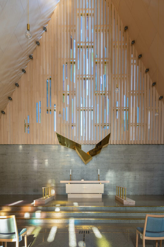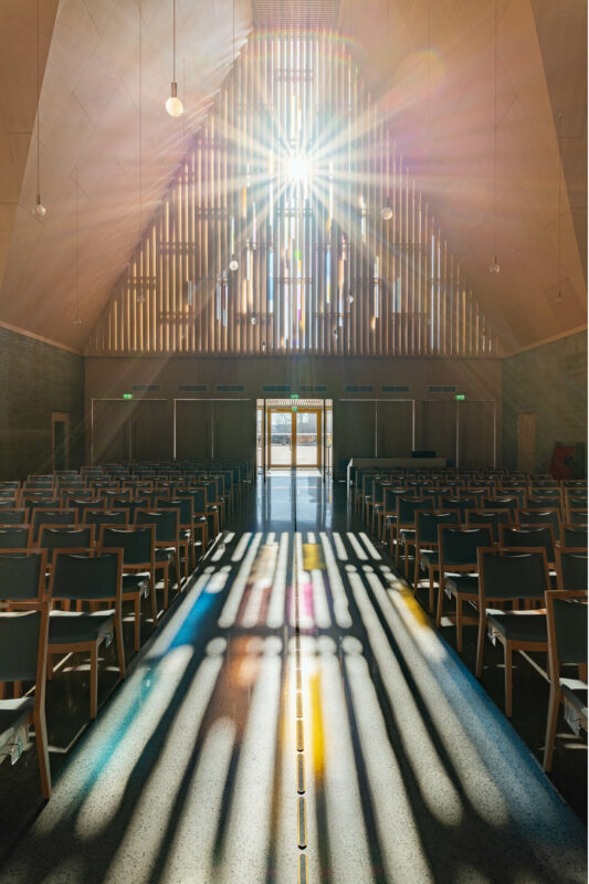 Men det kan også være et bestemt sted, rom eller arkitektur som er interessant å bryte arbeidet mot. I 2020 ferdigstilte jeg arbeidet med kunst til Sola kirke. Her jobbet jeg i dialog med arkitektene, slik at deler av kunsten er integrert i arkitekturen: I kirkens inngangsvegg og altervegg var det allerede tegnet inn skråstilte lameller som lyset skulle sive inn gjennom. Jeg valgte å jobbe videre med dette grepet, og lagde en komposisjon av kutt i lamellene i begge vegger, der jeg også inkluderte farget glass. Dette forsterket det arkitektoniske grepet, men bragte inn noe uregelmessig og uforklarlig. I tillegg til dette laget jeg en altertavle i banket messing, samt alle de liturgiske møblene.