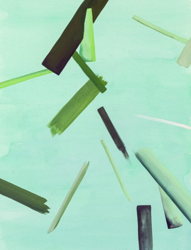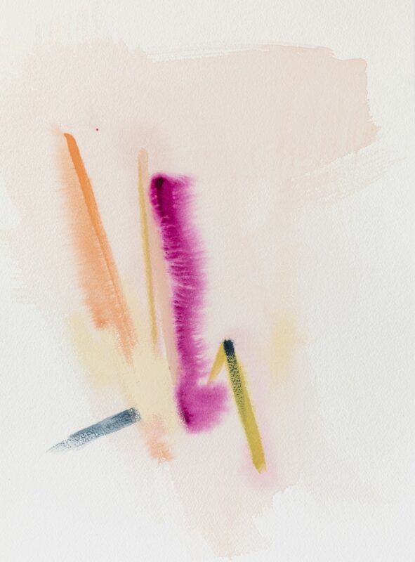 Helt nylig laget jeg et lite verk på papir, av akvarell og kaseintempera. Det er kjappe strøk, der pigmentene møter arket direkte og i høyt tempo. Umiddelbart kan det se ut som tilfeldige strøk i ulike retninger, men jeg jobber best når hånden har noe å bryte seg mot. Til dette lille verket har jeg hatt et digitalt mønster som utgangspunkt, et mønster jeg selv har laget ved å bruke et 3D-program «feil». Mønsteret som oppsto har jeg tegnet opp for hånd igjen og igjen til jeg det sitter utenat, og et lite utdrag av dette er altså forlegget til det lille arbeidet. Når jeg jobber helt uten noe å bryte mot så blir det til at hånden repeterer sine egne former, og jeg ender til slutt med generiske former som jeg fort mister interessen for.