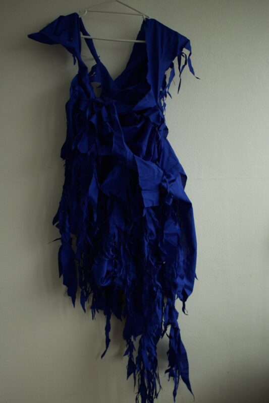 It is what happens when femininity refuses to behave. I laser-cut it into pieces; not out of rage, but relief. It was easier to shred the expectation than to squeeze into a shape that was maybe not meant to hold me. In this work, we see a royal blue dress made from repurposed fabric shreds and reassembled into the shape of a dress. it carries the silhouette of something meant to adorn. It references something meant to be worn, admired, or contain yet it resists function, containment, and ease. It’s a dress that remembers being worn, but it later made space for something else entirely, more like decaying into a new beginning.