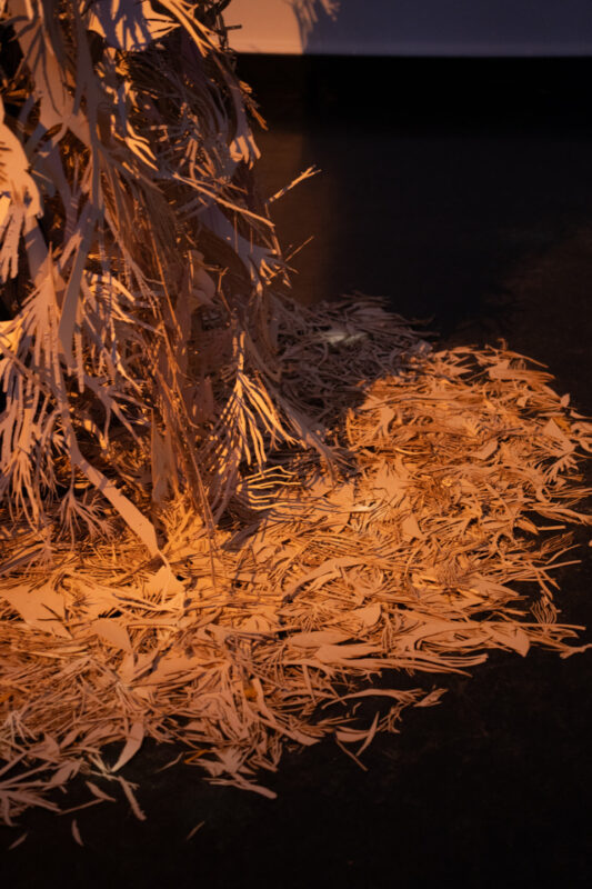 In my most recent installation Table of Air, shown at Bergen Kunsthall earlier this year, I worked with countless laser-cut mycelial forms in cardboard, stitched and assembled with raffia into a fragile form of a pillar stretching across from the center of the room to the walls, threatening collapse. I was thinking about the mushroom; specifically, the Kabaala, a sacred and indigenous mushroom from Buganda as both a spiritual and communal force. It nourishes, it gathers, it disappears. In that, it holds the memory of something shared, something devoured.