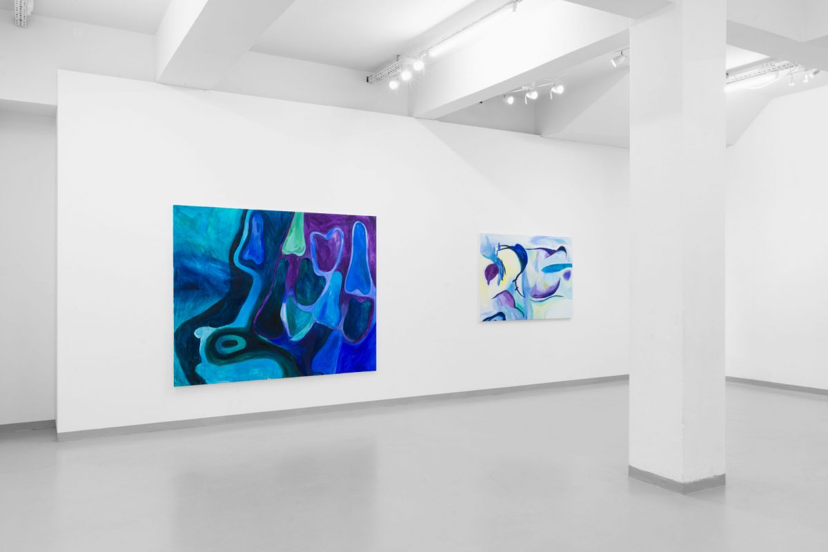 På atelieret arbeider jeg med store fargerike oljemalerier. Akkurat nå er jeg opptatt av Kandinsky, men ikke teoriene hans, men måten malingen er lagt på lerretet, formene og møtene mellom fargene.