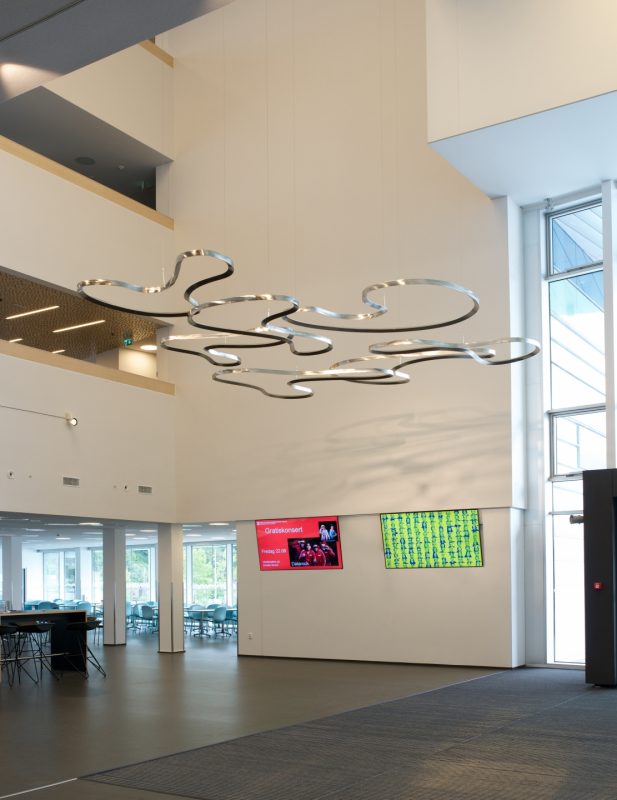Installasjonen Vann i vestibylen til Amalie Skram Skole, Bergen er basert på samspillet av 9 uregelmessig formete ringelementer. Ringene er formet slik at de balanserer i en horisontal posisjon selv om de kun er festet i et eneste punkt. Hengt ned fra taket med vire får de dermed evnen til å sirkulere rundt dette tyngdepunktet. Samordnet overlappende i to plan fører dette til uendelig mange kombinasjoner, en uforutsigbar varierende bevegelse med skiftende lysreflekser, ikke ulikt en bølgende vannoverflate: