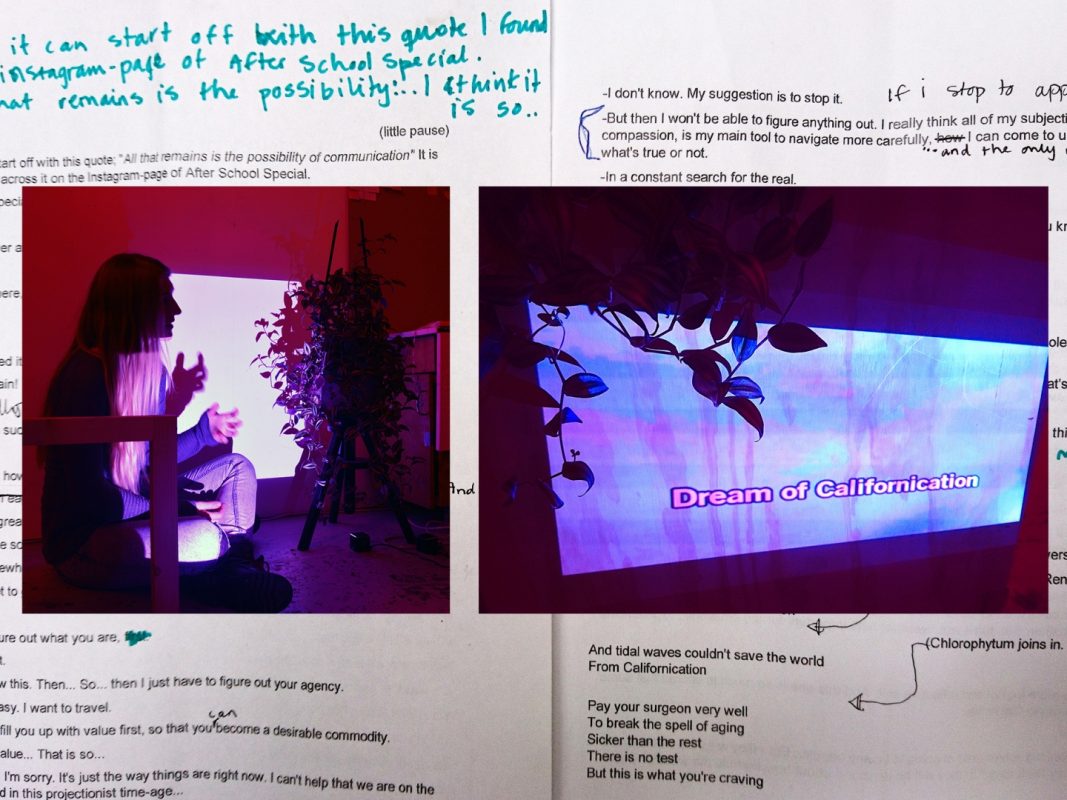 Master-prosjektet mitt «Suddenly, you complete me» var en video-installasjon, litt som et utdrag av en stue med en slags dokumentar som ble vist på en TV-skjerm. Der møtte vi en dame idet hun gikk til innkjøp av en plante-person, og innledet et samboerskap med denne. Hun søker å fylle et tomrom med en gjenstand hun ikke helt forstår, og har enorme forventninger som blir knust. Men i det minste er hun ikke ensom lenger.