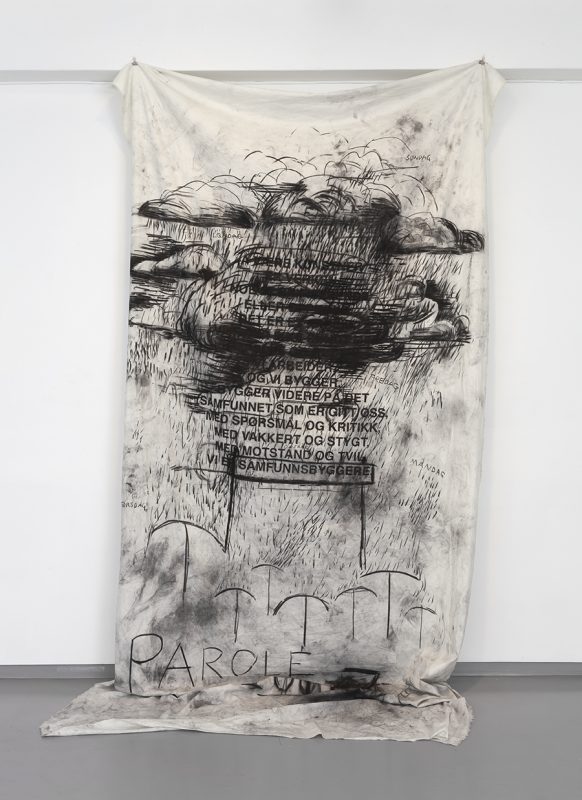 Visuelt har jeg et sort-hvitt grafisk uttrykk, som tydelig er tilstede, er utført direkte og er, fra min side, rått og upolert. Arbeid med kunst må ha rom for tilfeldigheter og det intuitive i selve utførelsen er viktig for meg, det er så lett å tegne noe dødt. Selve verket blir, om det så er en tegning, et fargefotografi, et lydverk eller en debatt, en invitasjon til samtale. Her taler verket for seg, men utgangspunktet for min deltakelse er en interesse for politikk, en erfaring av å oppleve velstand og en alder som gjør det lettere nå enn før å si hva som har formet meg.